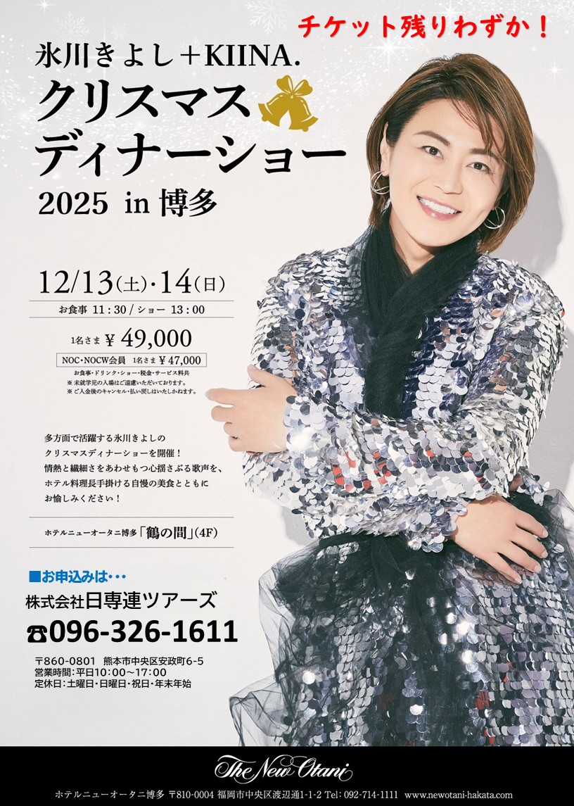 氷川きよし クリスマスディナーショー 2025.10.17 いよいよクリスマスシーズンが近づいてきました。 なんと、今年は氷川きよしさんのディナーショーのお申込を承っております。 予約数も限られておりますのでご興味あられる方はぜひご連絡ください。