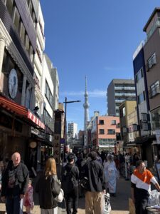 仲見世通りからふと見るとスカイツリーの姿が見えます。