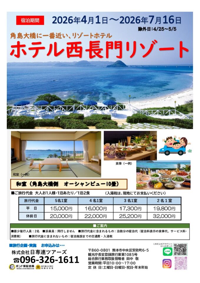 角島大橋に一番近いリゾーホテル。オーシャンビューの客室、温泉露天風呂、新鮮な海の幸、観光など思い思いの時をお過ごしください。